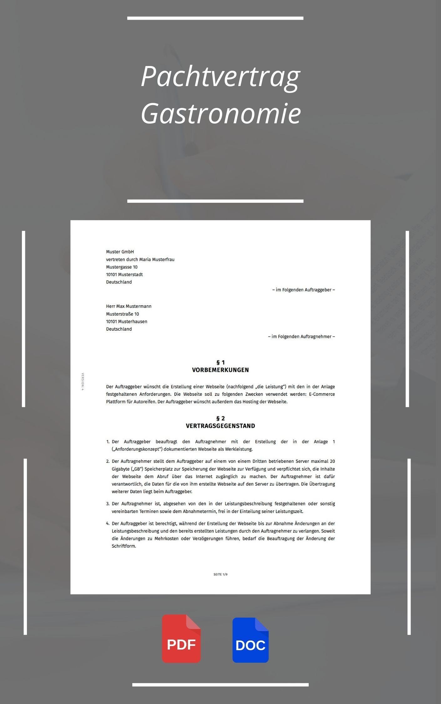 Antwort: Ein typischer Pachtvertrag für die Gastronomie besteht aus einer Titelseite, dem eigentlichen Vertragstext, einem Anhang mit Inventarliste, eventuellen Anlagen wie Betriebserlaubnis oder Speisekarte, sowie den Unterschriften der Vertragsparteien.